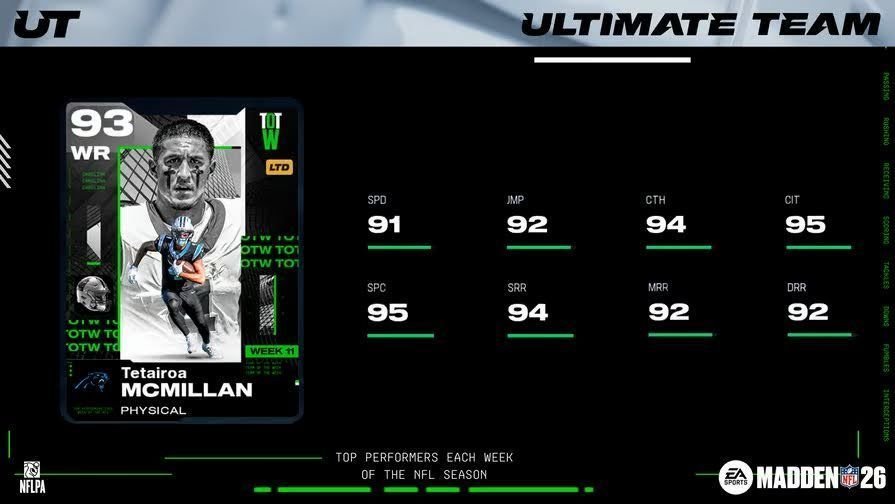 O TOTW 11 é liderado pelo wide receiver do Carolina Panthers, Tetairoa McMillan, cujas oito recepções para 130 jardas e dois touchdowns fizeram um trabalho pesado na vitória dos Panthers por 30-27 sobre o Atlanta Falcons. McMillan recebeu um item de edição limitada 93 OVR por seu problema. O linebacker do Buffalo Bills, Terrel Bernard, conseguiu uma carta semelhante graças a oito tackles solo e dois passes defendidos durante o jogo de domingo contra o Tampa Bay Buccaneers.