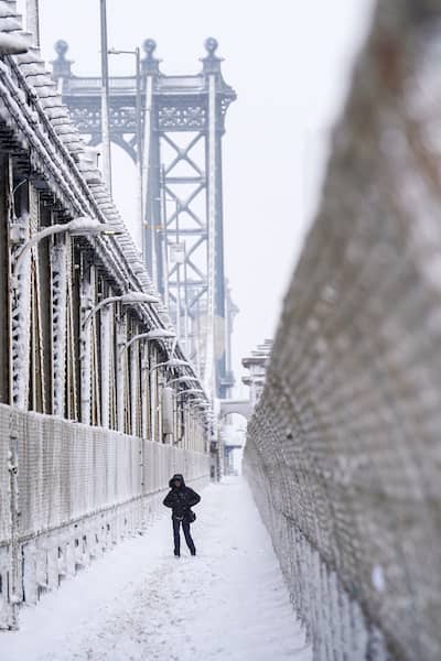 Em Nova Iorque, os arranha-céus de Wall Street são pouco visíveis do bairro vizinho de Brooklyn. No entanto, embora haja menos pessoas do que o normal nos metrôs, onde ocorrem atrasos, a tempestade não impede os nova-iorquinos de irem trabalhar.