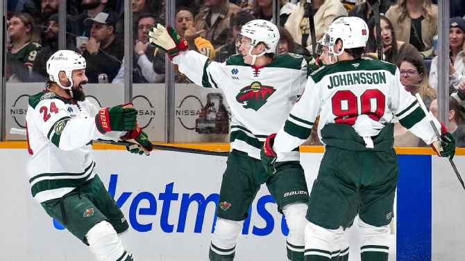Matt Boldy, do Wild, marca três gols apenas no primeiro período para completar o hat-trick.