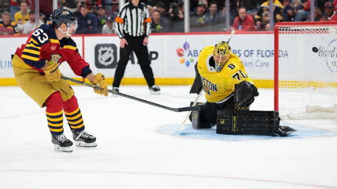 Brad Marchand marca o que seria o vencedor do jogo para os Panteras em uma disputa de pênaltis contra os Bruins.