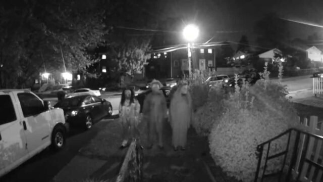 As ações do trio mascarado, um usando máscara de palhaço, outro fantasiado de Michael Myers da franquia de filmes de terror “Halloween” e o terceiro fantasiado de freira, foram registradas por uma câmera de segurança colocada do lado de fora da casa de uma família em Alexandria, Virgínia.