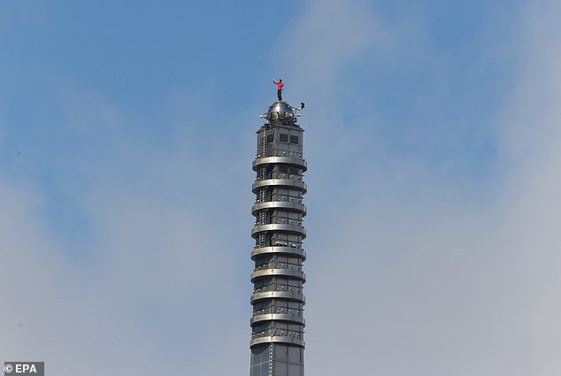 Aplausos irromperam de uma multidão reunida quando ele começou a escalar a torre na manhã de domingo.