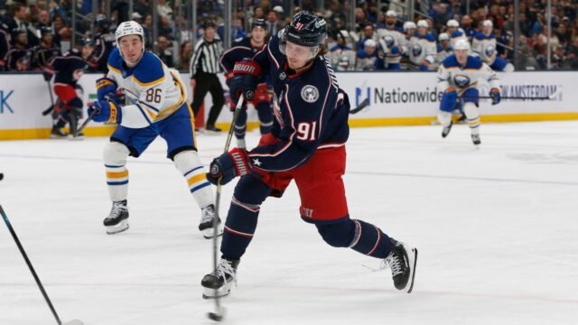 COLUMBUS, Ohio – O Columbus Blue Jackets marcou três gols no primeiro período, incluindo um shorthanded, para vencer o Buffalo por 5 a 1 no sábado, quebrando a seqüência de 10 vitórias consecutivas do Sabres, líder da liga.