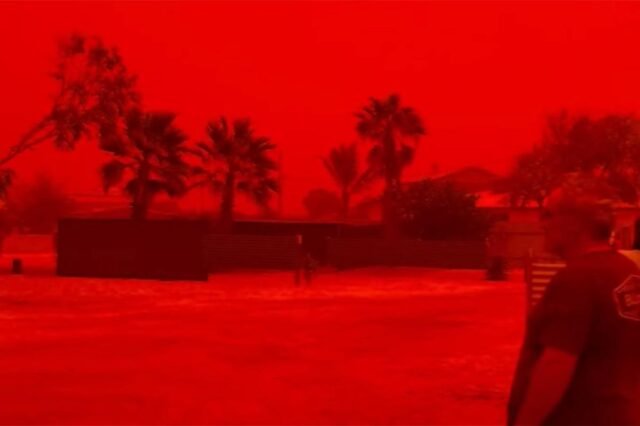 Os céus em outras partes da região estavam envoltos em um brilho laranja incomum, mas muito menos assustador, devido às nuvens de poeira rodopiantes desencadeadas pela poderosa tempestade.