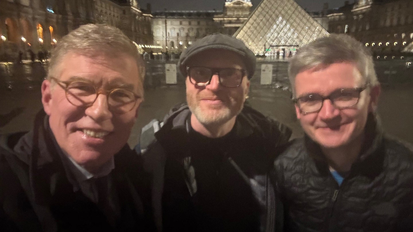 Equipe da Fox News, a partir da esquerda, Greg Palkot, o cinegrafista John Templeton e o produtor Simon Owen, no Louvre em Paris em 21 de outubro de 2025. (FoxNotícias)