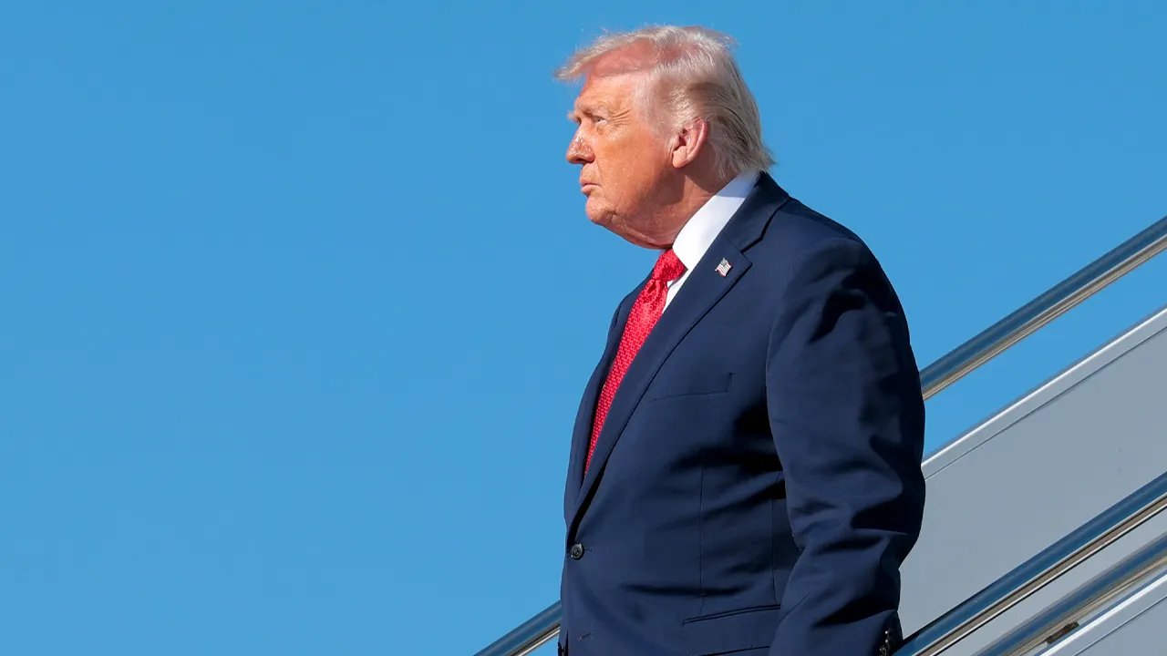 O presidente Donald Trump desce as escadas do Força Aérea Um ao chegar à Base Conjunta Andrews, em Maryland, em 13 de janeiro de 2026. (Luis M. Álvarez/AP)