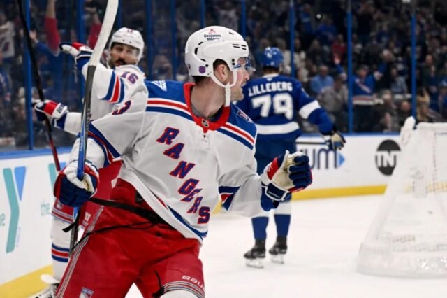 Will Cuylle, JT Miller, Alexis Lafrenière e Will Borgen marcaram para o Rangers, enquanto Scott Sabourin, Zemgus Girgensons e Jake Guentzel foram os marcadores para o Lightning.