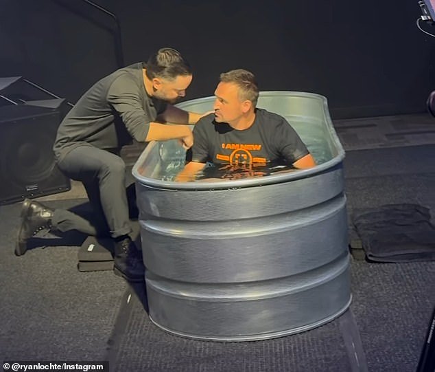 As imagens mostram Lochte sentado na pia batismal – neste caso, uma banheira de metal – antes de ser derrubado pelo homem que realizava a cerimônia na Canvas Church, na Flórida.