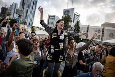 Centenas de pessoas reuniram-se na “Praça dos Reféns” de Tel Aviv; Muitos tinham um adesivo que dizia “Eles estão voltando”, enquanto outros se abraçavam e se parabenizavam.