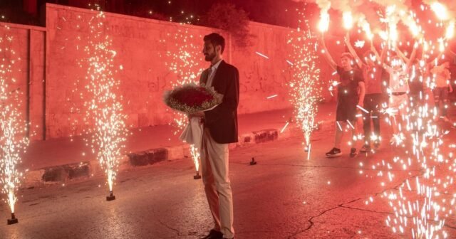 “Eles vão!” Ele gritou quando uma série de veículos chegou, liderados pelos noivos, um suv branco adornado com rosas vermelhas. O céu acima da cidade de Binnish, no noroeste da Síria, explodiu em explosões coloridas, e os caminhantes agitaram sinalizadores e brilhos.