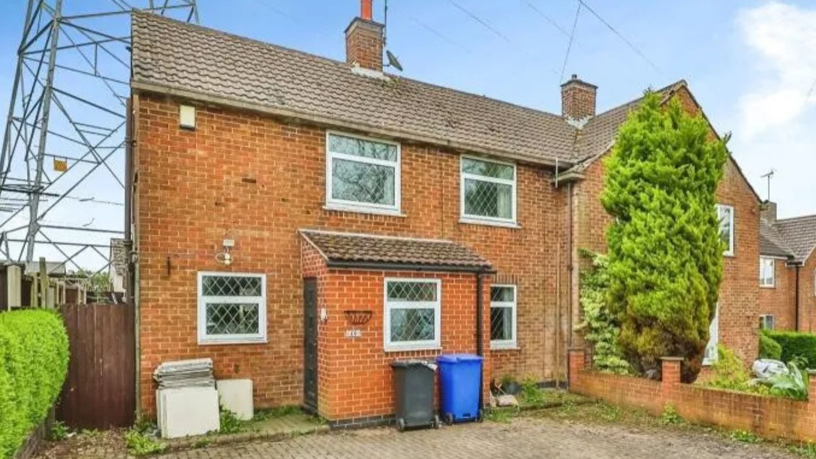 A propriedade geminada vem com postes de eletricidade gigantes no jardim e certamente seria um ponto de conversa em um churrasco de verão.