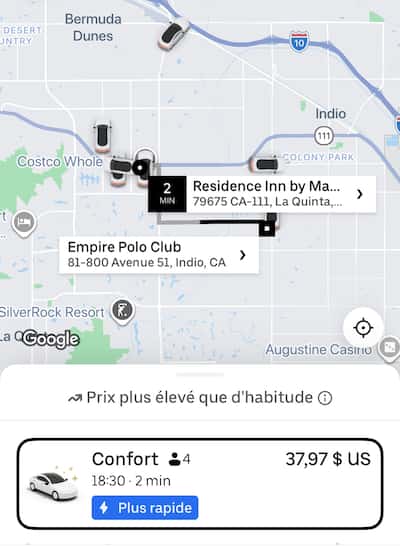 Um passe para o ônibus oficial está disponível por US$ 113. Do lado do Uber, os preços podem subir rapidamente: em 11 de abril, uma viagem de dois minutos de um hotel local até o local do festival custava US$ 52,56.