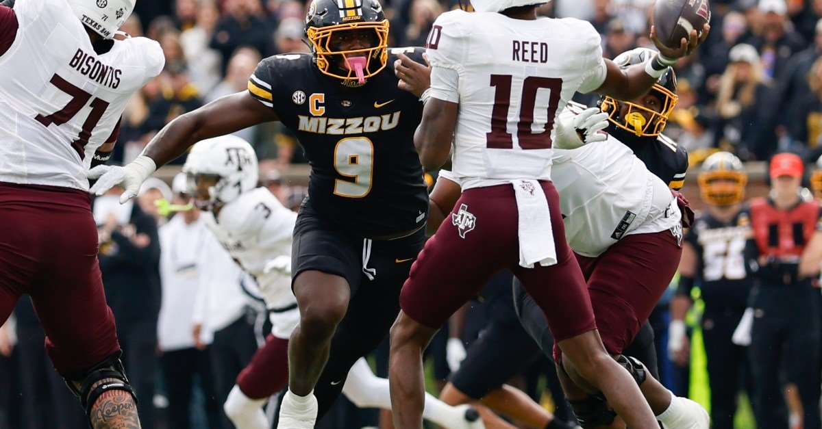 COLUMBIA, MO – NOVEMBRO 08: O tight end do Texas A&M Aggies, Nate Boerkircher (87), tenta romper o tackle do linebacker Josiah Trotter (40) do Missouri Tigers e do safety Santana Banner (15) do Missouri Tigers depois de fazer a recepção durante um jogo de conferência da SEC entre o Texas A&M Aggies e o Missouri Tigers Field Tigers, novembro de 2020, Memorial Stadium, Faurot 5, Faium. Colômbia, MO. (Foto de Rick Ulreich/Icon Sportswire via Getty Images