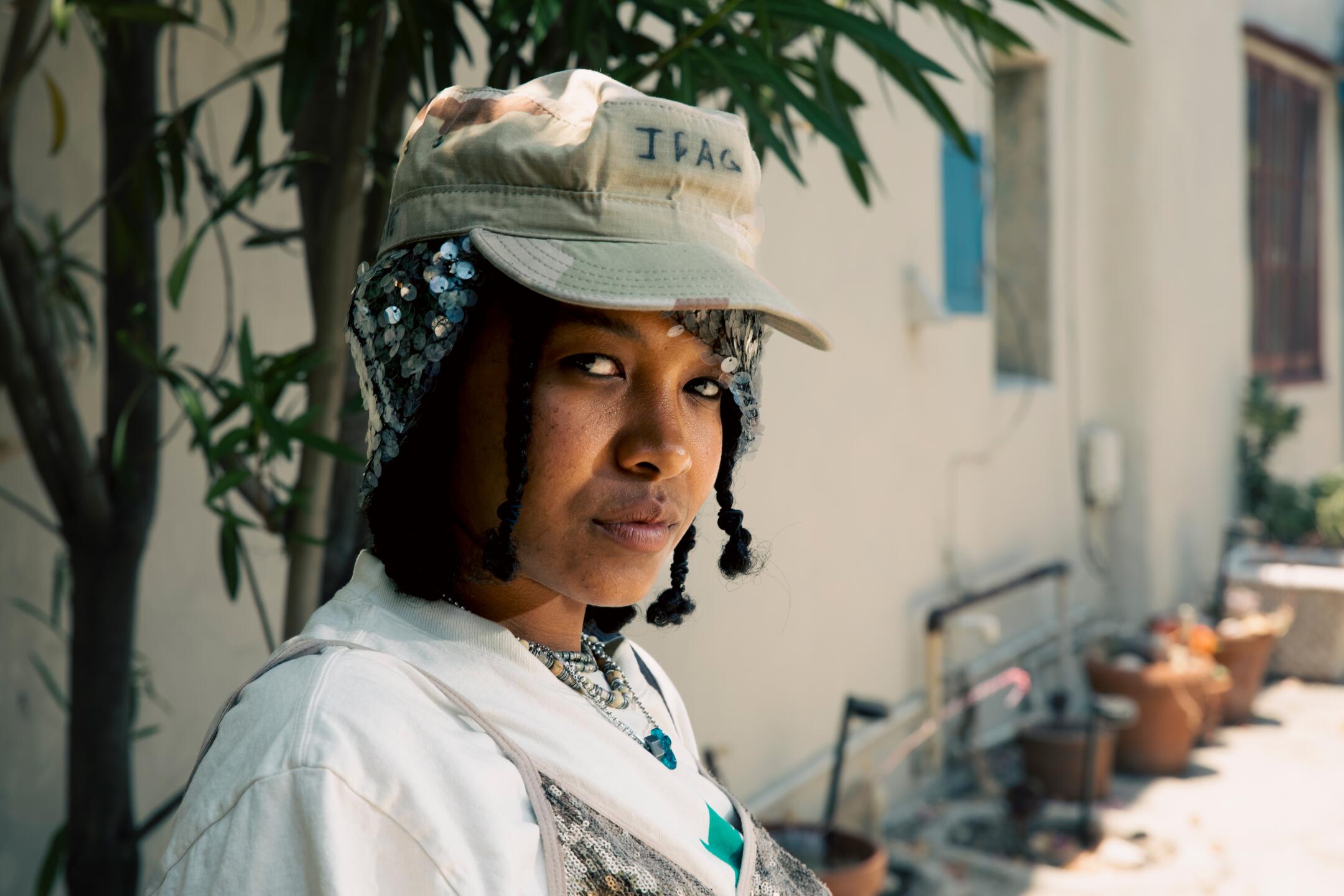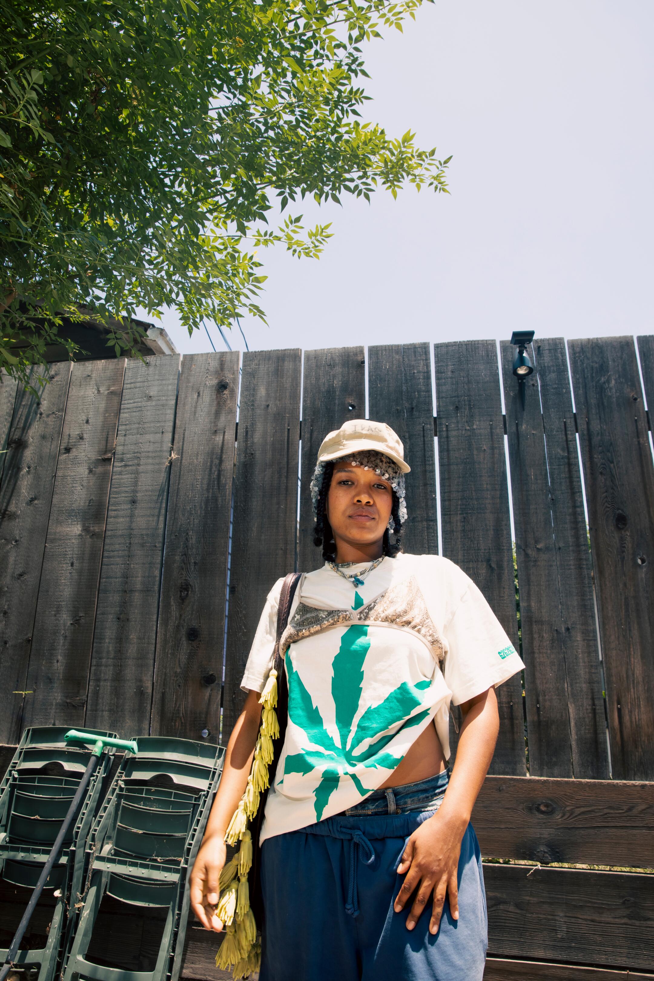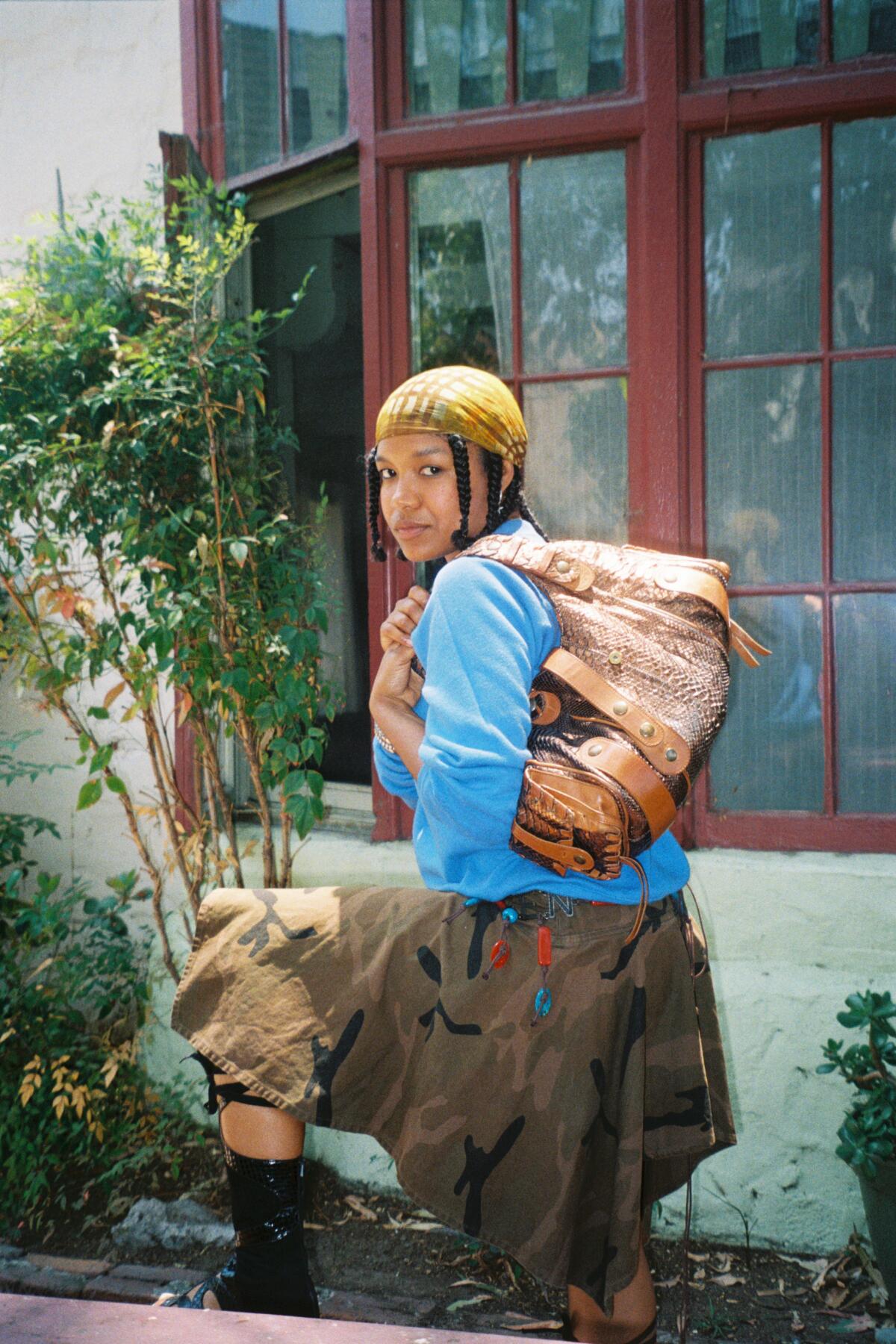 Um acessório que ganhou vida própria, este chapéu militar, com letras desbotadas Sirva-se Os anéis enferrujados pertenciam originalmente ao pai de Thomas durante a Guerra do Iraque, quando ele apresentou um show de comédia para as tropas americanas. Thomas agora o incorpora regularmente em seu guarda-roupa. “Ele deu para Rasheed (namorado dela). Mas eu roubei dele. Parece melhor para mim.” Embora a boina militar esteja em sua família há anos, ela só a adquiriu recentemente, o que lhe permitiu reter um pedaço do passado de seu pai. “Eu simplesmente vivi e adorei.”