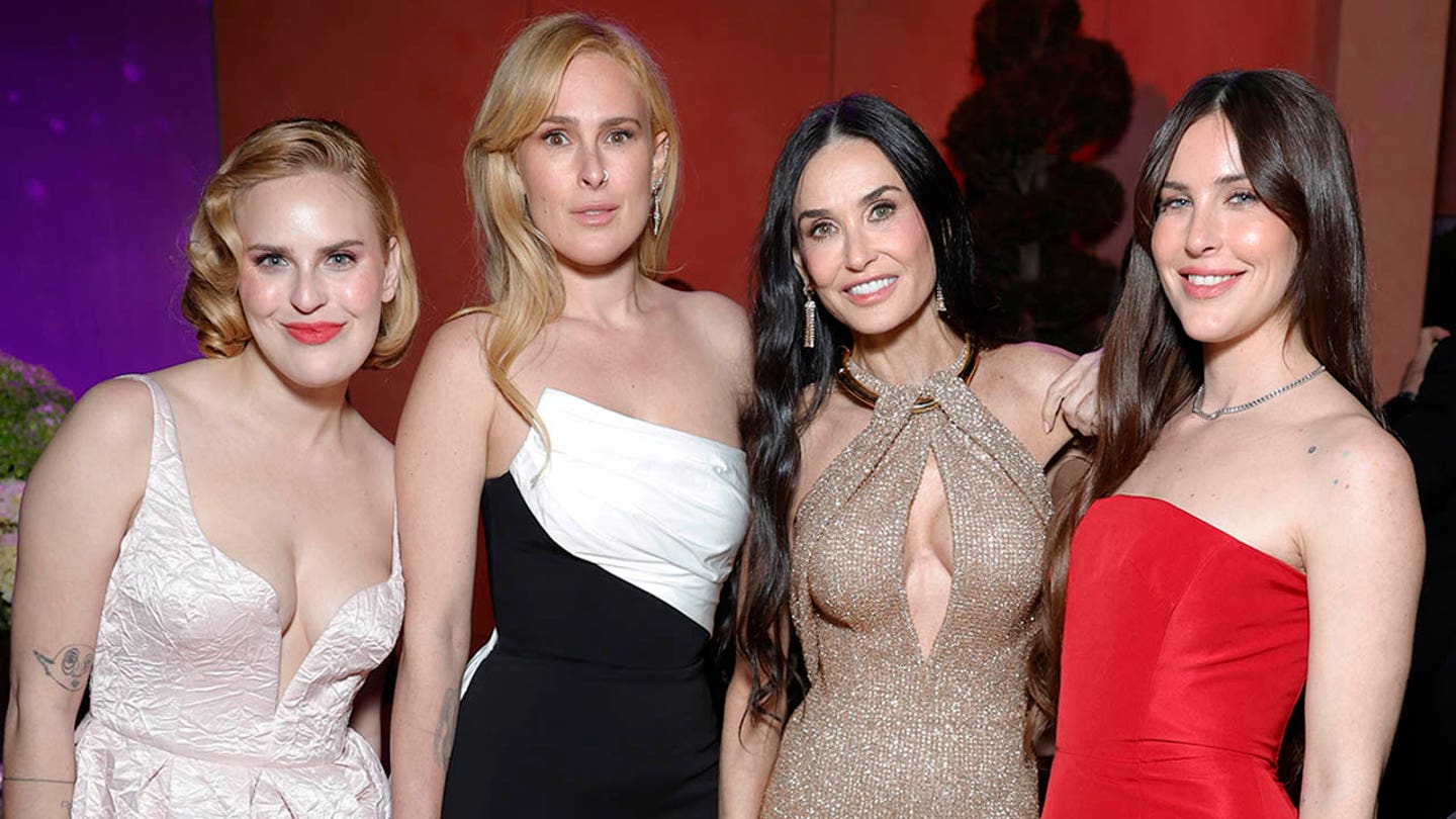 (LR) Tallulah Willis, Rumer Willis, Demi Moore e Scout Willis participam da festa do Oscar da Vanity Fair em 2025. (Stephanie Keenan/VF25/WireImage para Vanity Fair)
