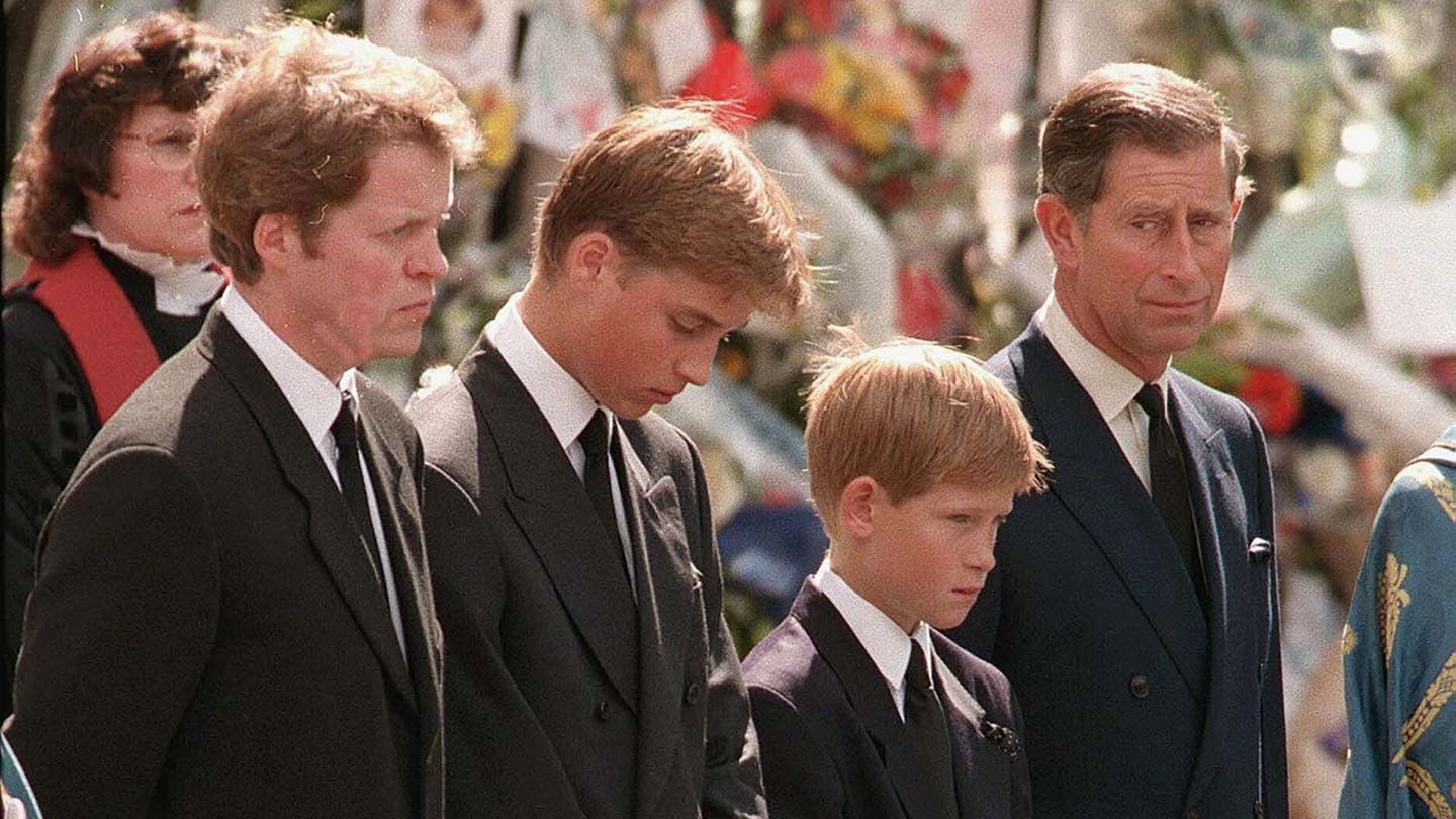 A partir da esquerda: Earl Charles Spencer, Príncipe William, Príncipe Harry e Príncipe Charles seguem o caixão da Princesa Diana em seu funeral em 6 de setembro de 1997 em Londres. (Anwar Hussain/WireImage)