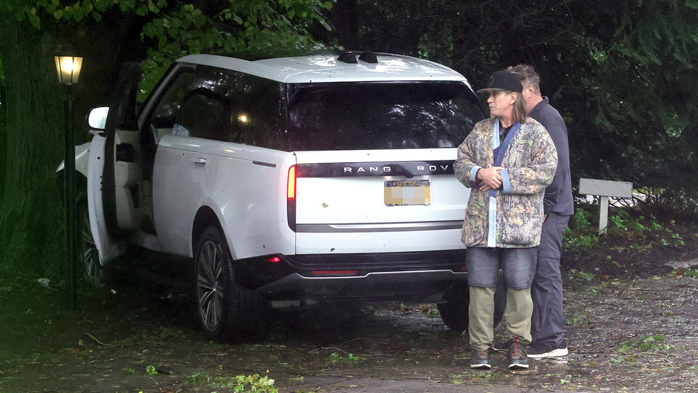 Alec Baldwin foi fotografado depois de bater seu Range Rover em uma árvore nos Hamptons na segunda-feira. (Matt Agudo/Imagens Instar)