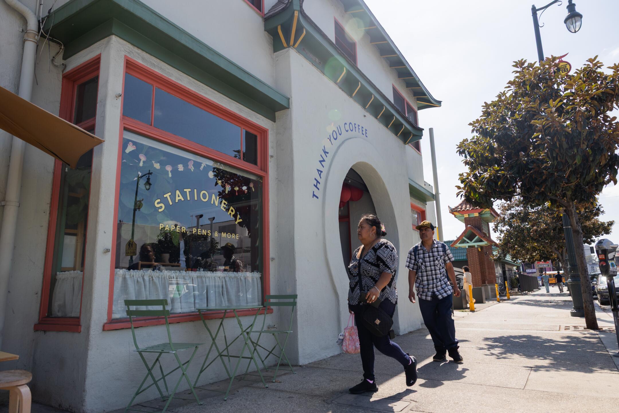 Fredia Nimura do lado de fora de sua loja Paper Plant Co., que ocupa duas vitrines em Chinatown e divide espaço com a Thank You Coffee. Nimura passou a adolescência no Japão antes de mudar de carreira.