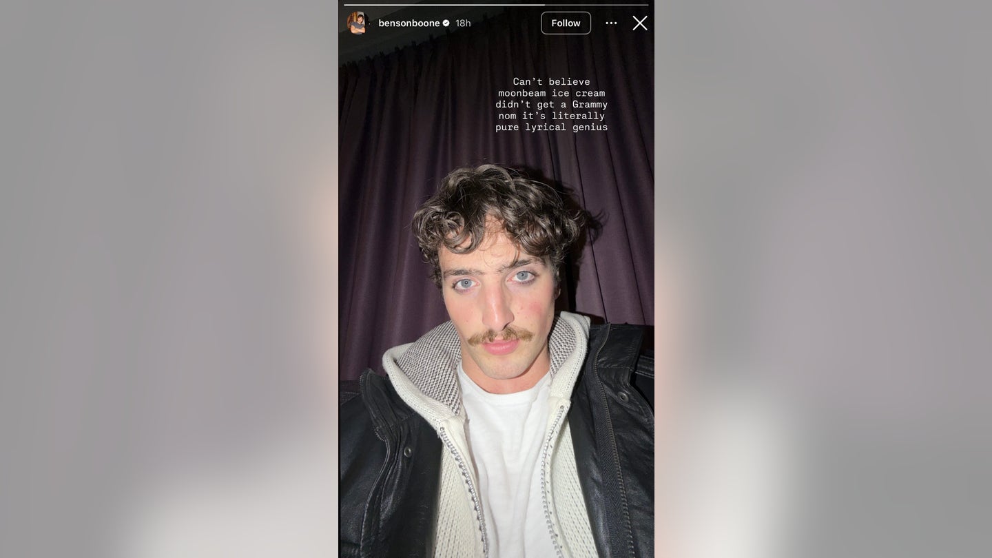 Benson Boone acessou sua história no Instagram para responder ao desprezo por “Mystical Magical” do Grammy. (Benson Boone/Instagram)