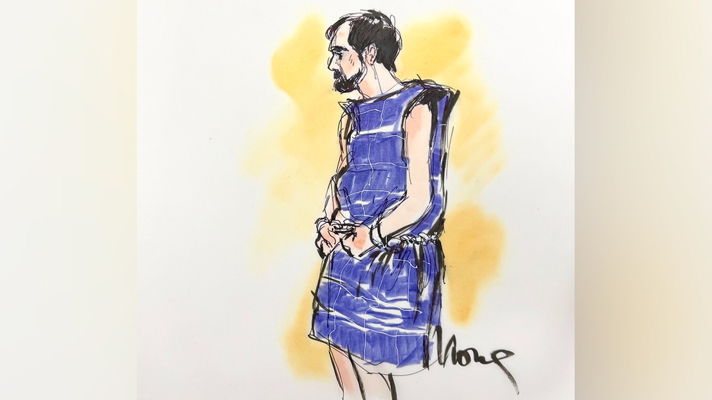 Nick Rayner, visto em um esboço do tribunal, usa um colete azul de prevenção de suicídio no tribunal na quarta-feira, 17 de dezembro de 2025. (Mona Edwards)