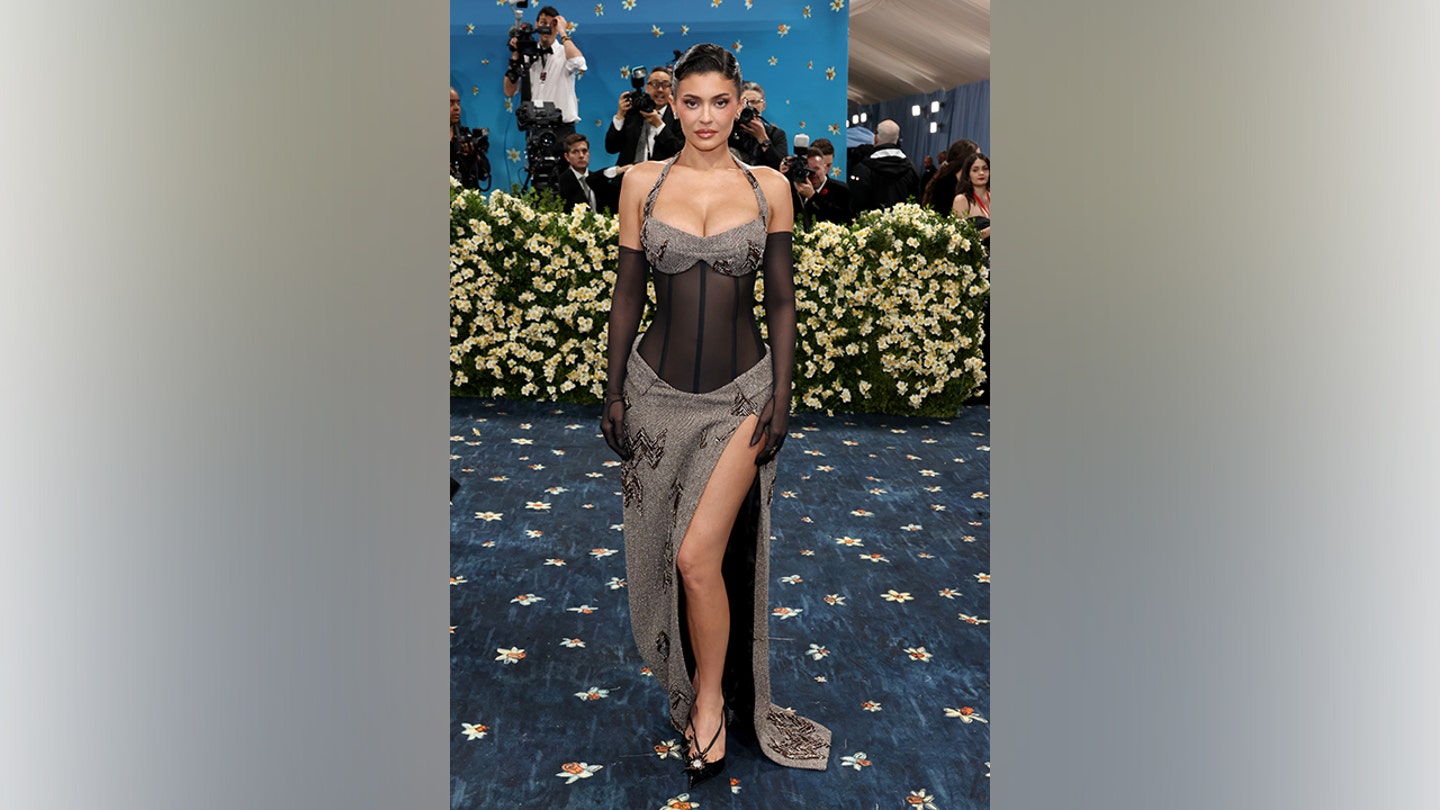 Kylie Jenner chegou ao Met Gala de 2025 com um vestido sexy e espartilho transparente com decote profundo e fenda na altura da coxa.