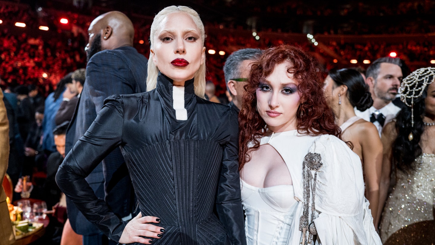 Lady Gaga e Chappelle Rowan, vestindo seu terceiro traje da noite, posam juntas no Grammy Awards. (John Shearer/Imagens Getty)