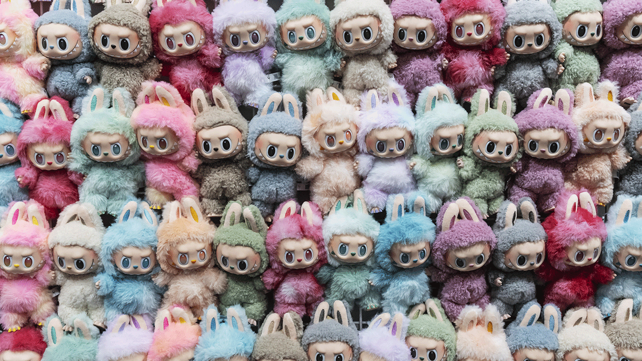 Uma parede Labubus em exposição em um Pop Mart. Crédito da foto: Qilai Shen/Bloomberg via Getty Images