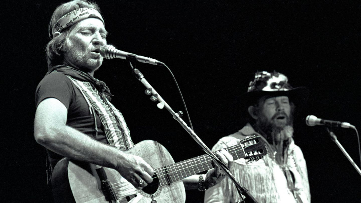 David Alan Coe (à direita) junta-se a Willie Nelson no palco do Omni Amphitheatre em Atlanta, Geórgia, em 11 de dezembro de 1981. (Rick Diamond/Imagens Getty)