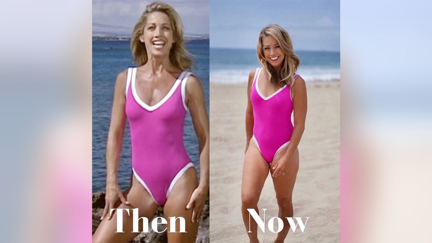 Denise Austin adora exibir seus collants e trajes de banho dos anos 80 e 90 nas redes sociais para mostrar o poder de seu físico. (denise austin. com)