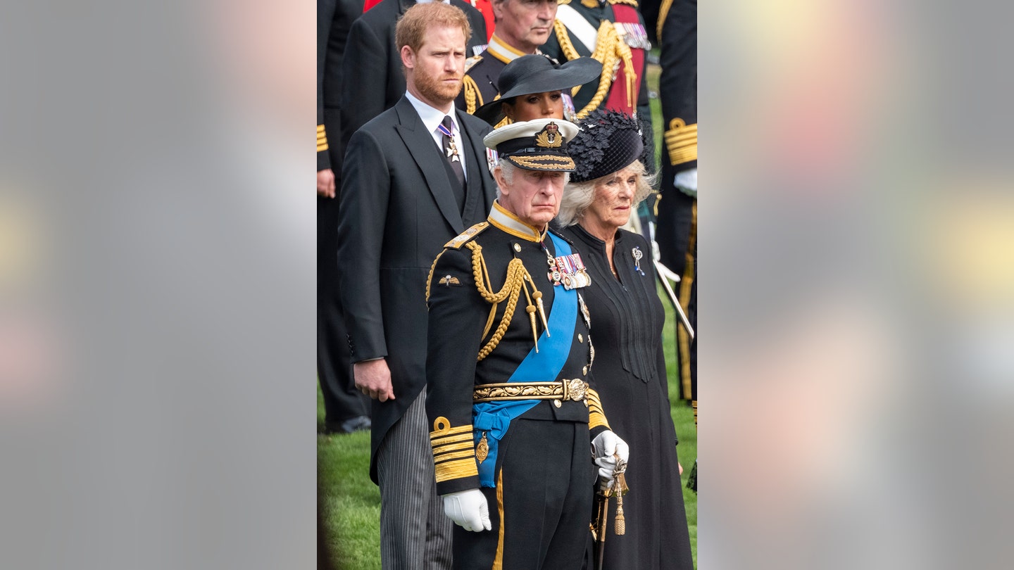 O Príncipe Harry, o Rei Charles e a Rainha Camilla comparecem ao funeral da Rainha Elizabeth II em 19 de setembro de 2022 em Londres. A rainha que reinou por mais tempo na Inglaterra morreu no Castelo de Balmoral, na Escócia, em 8 de setembro de 2022, e foi sucedida por seu filho mais velho, Charles. (Brynn Colton/Imagens Getty)