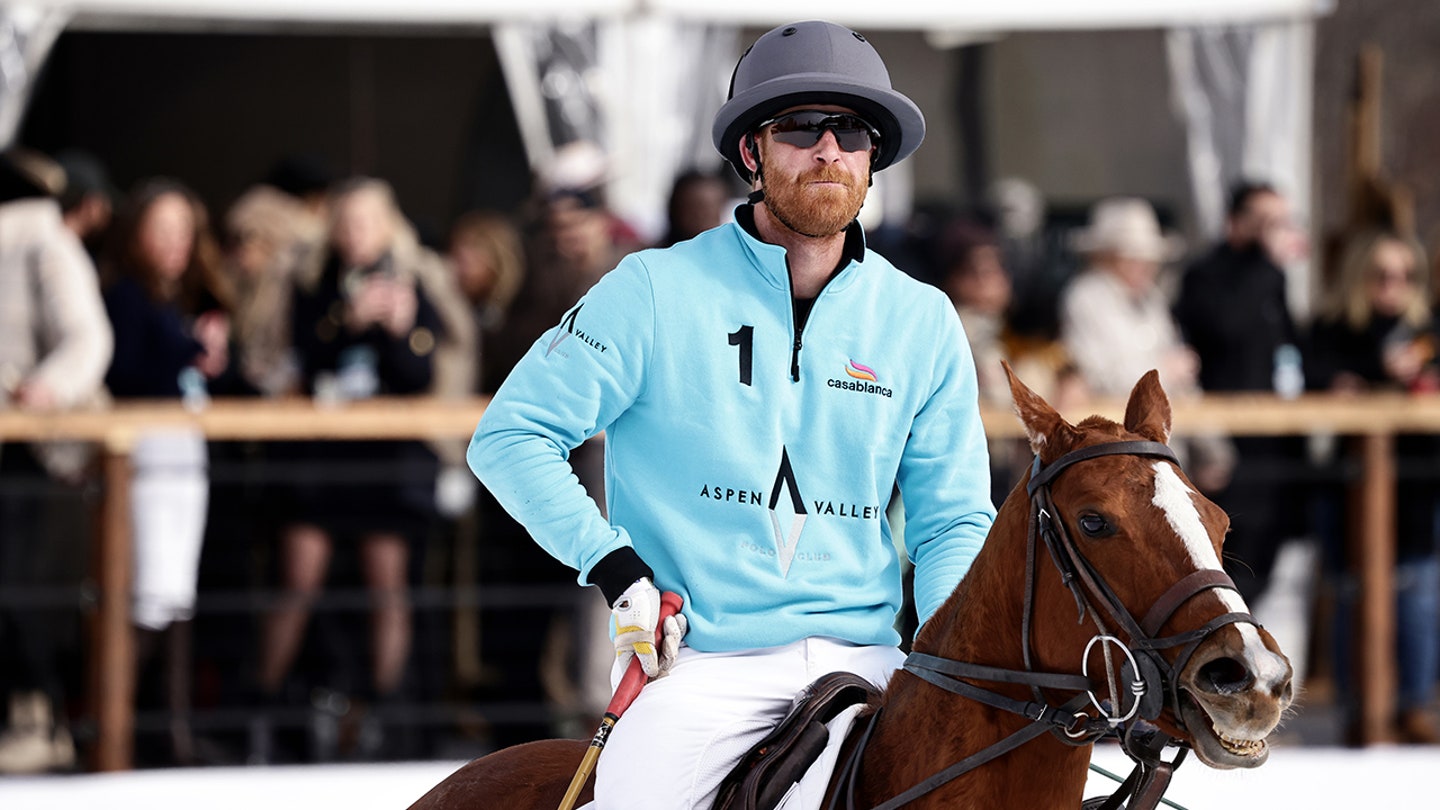 O príncipe Harry, duque de Sussex, anda a cavalo durante um intervalo durante o Campeonato Mundial de Pólo de Neve St. Regis de 2025 no Parque Rio Grande em 18 de dezembro de 2025, em Aspen, Colorado. (Greg Doherty / Getty Images para St. Regis)