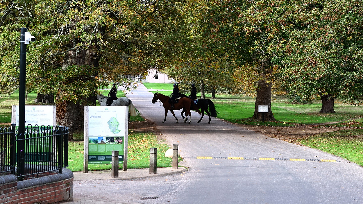 Cavaleiros são vistos perto do Royal Lodge onde Andrew está hospedado no Windsor Great Park em 25 de outubro de 2025. (Peter Nichols/Imagens Getty)