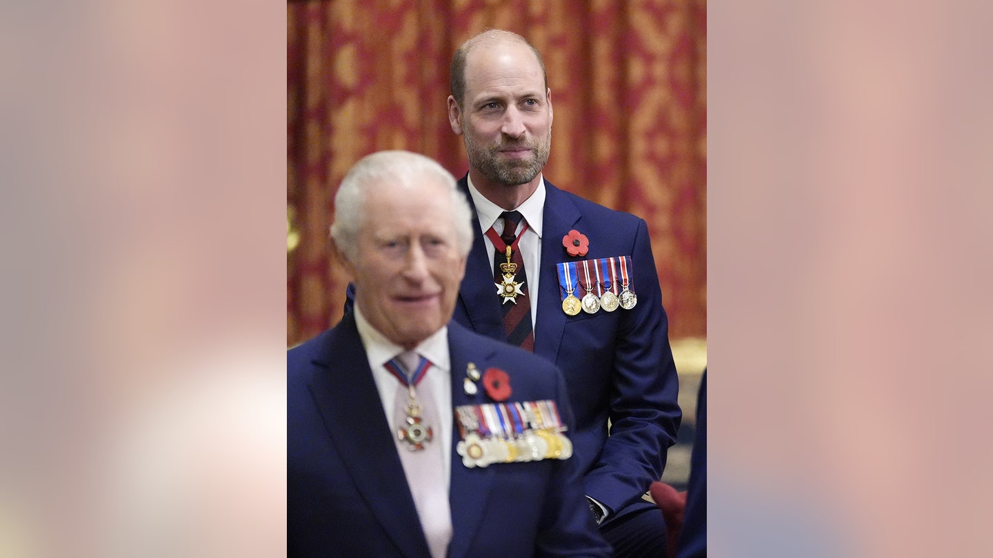 O Príncipe William e o Rei Carlos III participam de uma recepção para veteranos que serviram na Segunda Guerra Mundial no Castelo de Windsor em 11 de novembro de 2025. William, pai de três filhos, é herdeiro do trono britânico. (Andrew Matthews/Pool/AFP via Getty Images)