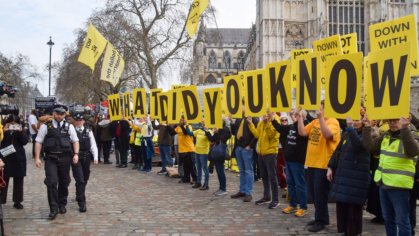 Os manifestantes do grupo antimonarquia “República” carregavam cartazes amarelos brilhantes dizendo coisas como “O que eu sabia?” Do lado de fora da Abadia de Westminster na segunda-feira, enquanto o Rei Charles, a Rainha Camilla, o Príncipe William e Kate Middleton entravam para a celebração anual do Dia da Commonwealth.