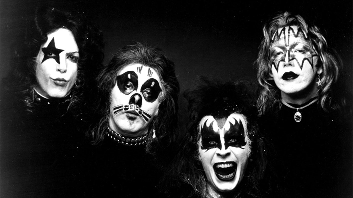(LR) Paul Stanley, Peter Criss, Gene Simmons e Ace Frehley da banda de rock ‘n’ roll KISS posam para uma foto da capa de seu álbum de estreia autointitulado, lançado em 18 de fevereiro de 1974. (Arquivos Jenny Wen / Michael Oakes / Imagens Getty)