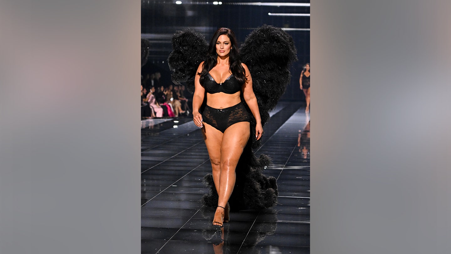 Ashley Graham usou um conjunto preto com asas na passarela do Victoria’s Secret Fashion Show. (Gilbert Flores/Variedade via Getty Images)