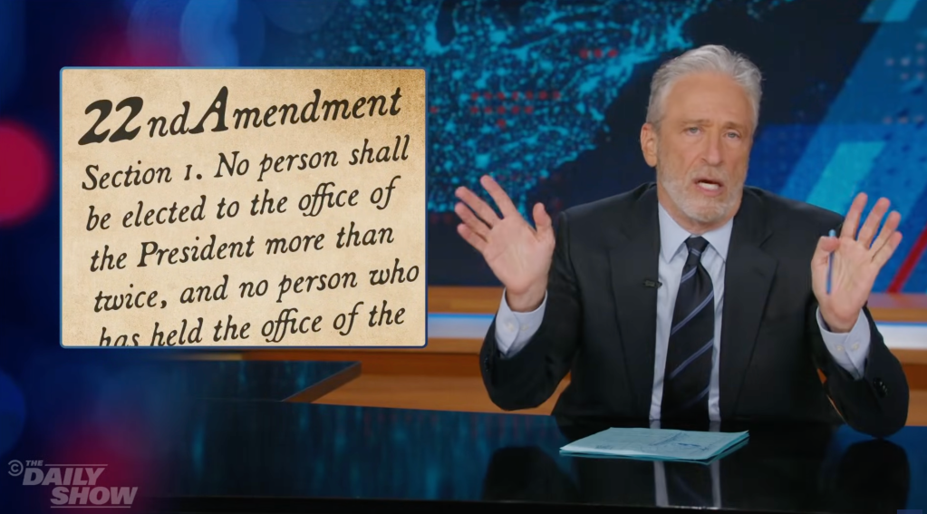 Nesse ponto, Stewart voltou sua atenção para a intenção de Trump de buscar um terceiro mandato – algo que ele havia anunciado “Eu gosto de fazer isso.” O ex-estrategista-chefe de Trump, Steve Bannon, alegando publicamente que existe um “plano”. violando a 22ª Emenda para tal termo.