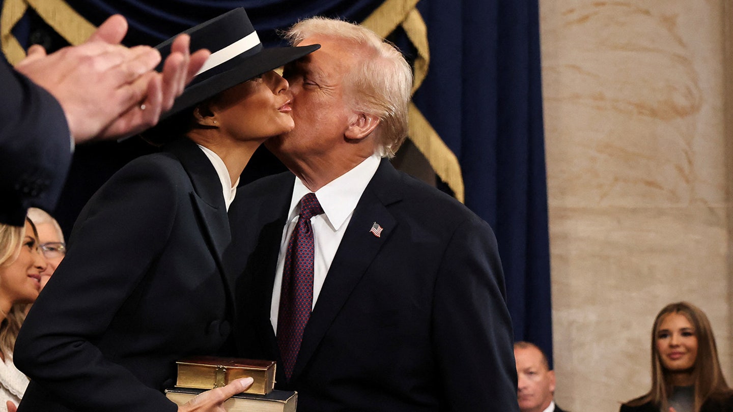 Donald Trump cumprimenta Melania Trump quando ela chega para a cerimônia de inauguração na Rotunda do Capitólio dos EUA em 20 de janeiro de 2025. (Chip Somodevila/Pool via Reuters)