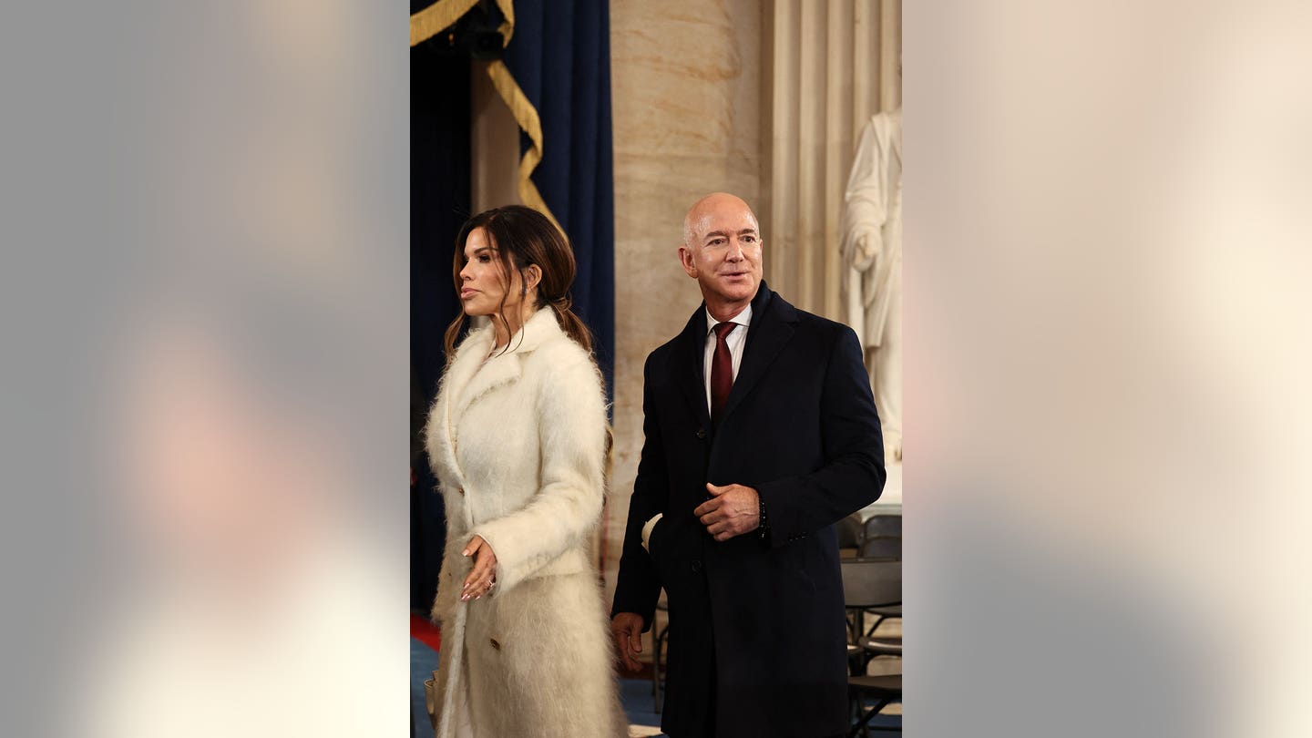 Jeff Bezos e sua então noiva Lauren Sanchez deixam a cerimônia de posse no Capitólio dos EUA em 20 de janeiro de 2025. (Chip Somodevilla/AFP)