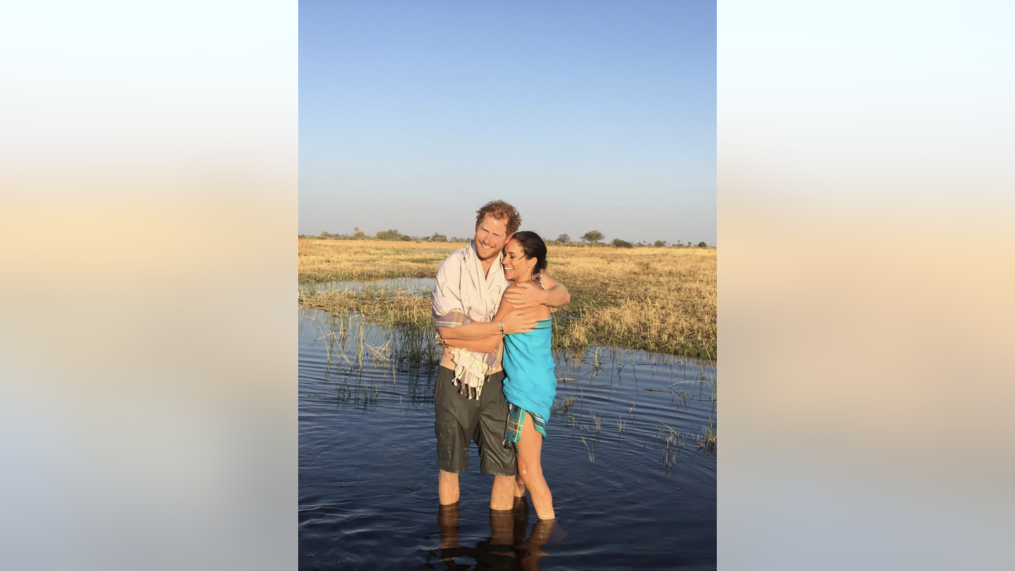 O segundo slide no carrossel de Markle mostrava uma foto antiga do casal, que foi visto radiante ao se abraçar, de joelhos no que parecia ser um bebedouro na savana.
