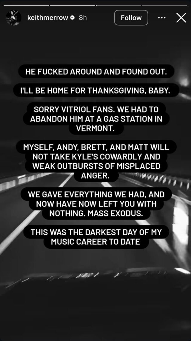O agora ex-guitarrista do Vitriol, Keith Merrow, compartilhou a notícia em suas histórias no Instagram. Em sua postagem, Merrow explicou que ele, o baixista Brett Leier e o baterista Andy Vincenzetti abandonaram o vocalista Kyle Rasmussen em um posto de gasolina em Vermont porque ele estava tendo “leves explosões de raiva mal direcionada”.