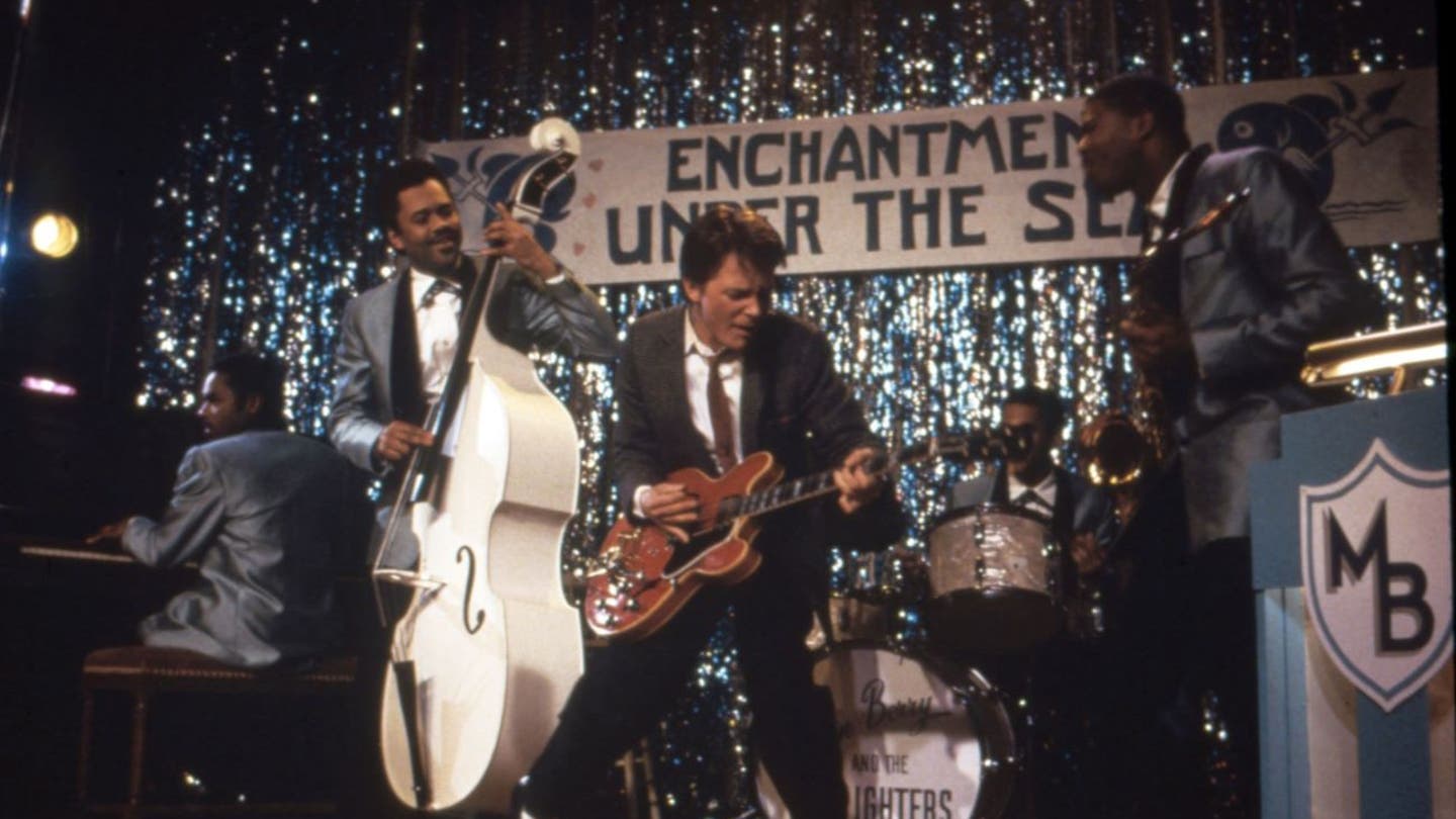 Michael J. Fox se apresenta durante a cena do baile de formatura em De Volta para o Futuro. (Sunset Boulevard/Getty Images)