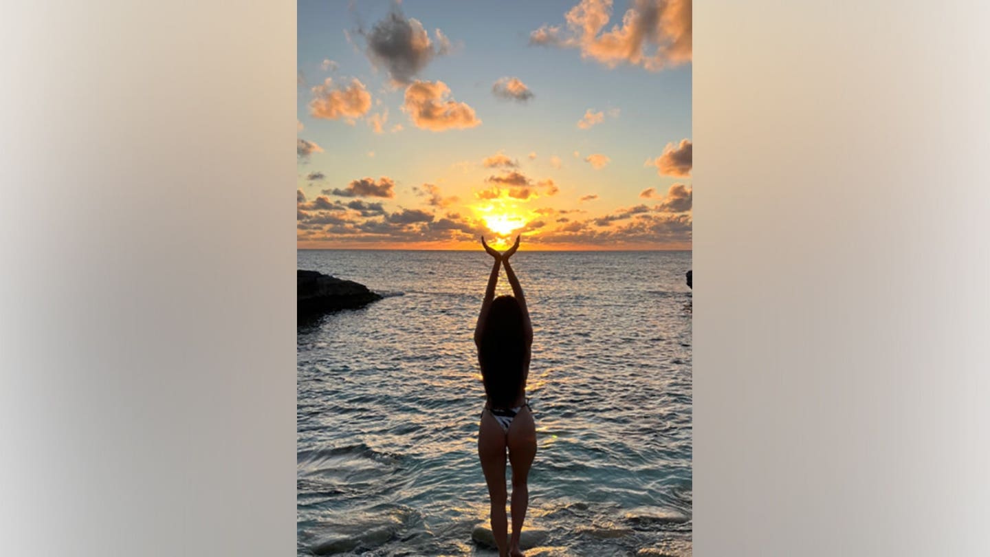 Nicole Scherzinger posa com o sol com as mãos levantadas. (Nicole Scherzinger/Instagram)