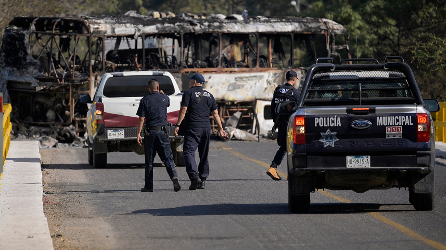 Membros da Polícia Estadual vigiam a Ponte Desimbucada perto de um ônibus em chamas na região metropolitana de Puerto Vallarta, no México, em 24 de fevereiro de 2026, após violência de gangues. (Alfredo Estrella/AFP via Getty Images)