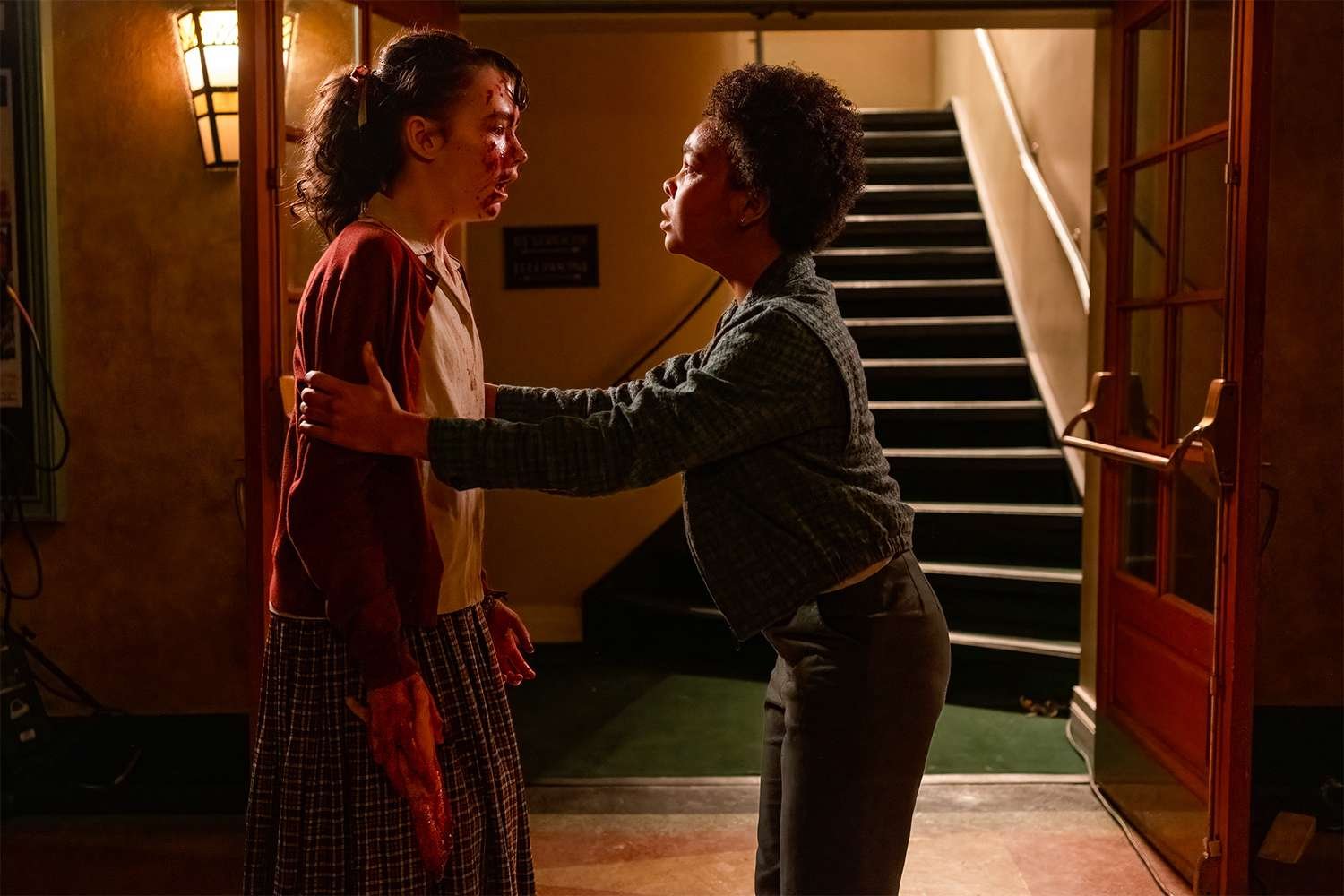 Para Stack, o outro único sobrevivente: “Honestamente, foi muito divertido filmar”, diz ela. “Pessoalmente, adoro filmar sequências de terror cheias de ação como essa. Havia tantas coisas legais sobre isso. Adorei aprender como bloquear, me abaixando nas cadeiras, subindo e saindo correndo com Ronnie e ficando coberto de sangue, gritando e chorando. Foi tudo muito divertido.”