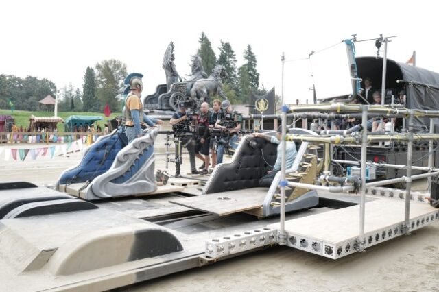 Controlar o clima era o mínimo. “Percy Jackson e os Olimpianos” construiu uma instalação de processo personalizada com duas cabines de carro – uma que poderia se mover de norte a sul e outra que poderia se mover de leste a oeste – onde os atores poderiam ficar em segurança; Então a cena poderia mostrar carruagens reais puxadas por cavalos dirigindo atrás deles e um caminhão puxando a carruagem na frente deles a alguma velocidade. Aparentemente, O’Loughlin estudou cuidadosamente as versões de 1925 e 1959 de “Ben-Hur” ao planejar a corrida. Mas ele também pegou dicas técnicas de “Gladiador” de Ridley Scott para retratar visualmente a condução de uma carruagem com intensidade real. 100 cavalos mortos (alegadamente).