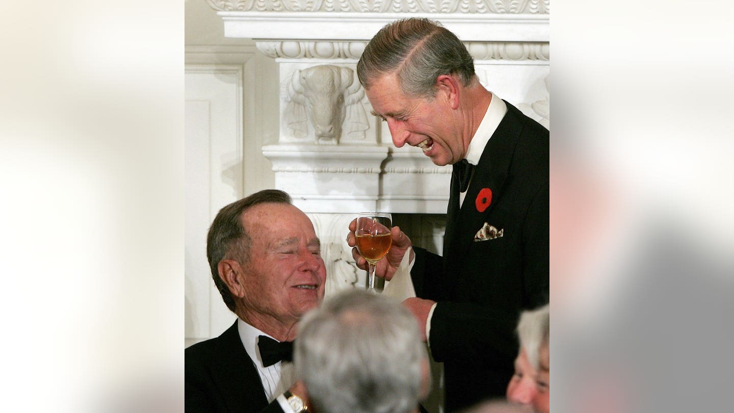 O ex-Príncipe de Gales brinca com o ex-presidente George H. W. Bush depois de fazer um brinde durante um jantar social na Casa Branca em Washington, D.C., em 2 de novembro de 2005. (Lucas Frazza/AFP)