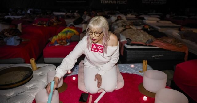 No evento, Raccio – que facilitou banheiros para empresas como Chanel, BMW e Parker Hotel – serve chá, toca instrumentos musicais (incluindo tigelas de quartzo tradicionais) e senta-se entre camas Hästens ultra-premium, incluindo um colchão Grand Vividus de US$ 720 mil, que ele chama de “o colchão mais caro do mundo”.