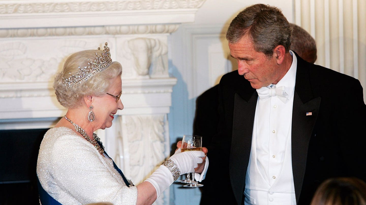O presidente George W. Bush e a rainha Elizabeth II brindam durante um jantar de Estado na Casa Branca em Washington, D.C., em 7 de maio de 2007, durante sua viagem aos Estados Unidos. (Biblioteca de fotos de Tim Graham/Getty Images)