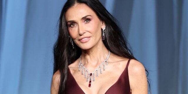 As ondas saltitantes e escovadas de Moore estavam em camadas em um vestido Merlot temperamental da Prada, refletindo a luz a cada passo. O crédito pelo visual deslumbrante vai para o famoso cabeleireiro Dimitris Giannetos, que quer trazer de volta a velha Hollywood como sua “versão mais moderna”, ele compartilhou em uma citação exclusiva.